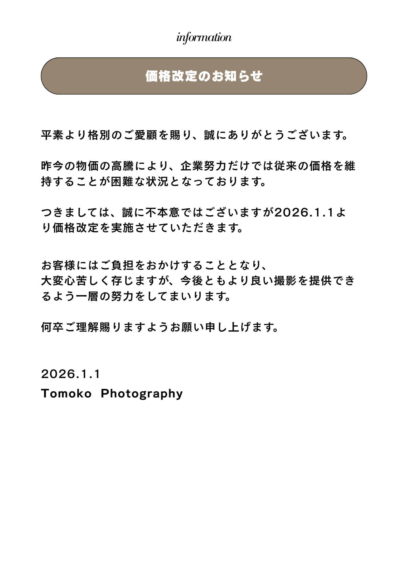 家族を紡ぐ写真 Creating Lasting Loving Memories Tomoko Photography は芦屋からお宮参り、七五三、家族写真などの出張撮影を行っています。 ***** 名前をつけたあの日のように、大切な今の一瞬を写真に その1枚が、家族の物語を紡ぎはじめます。 Tomoko Photographyはそんな家族の物語を残すお手伝いをしています。 お宮参り 七五三 家族撮影 入園・入学 振袖写真 お問合せご予約はお気軽にご連絡下さい。 メール 090-8376-6994 お知らせ 価格改定のお知らせ 振袖撮影のページができました
